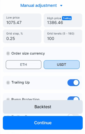 Функции Trailing Up и Trailing Down помогают поддерживать грид бота в соответствии с изменениями цены, когда рынок выходит за пределы исходного диапазона.