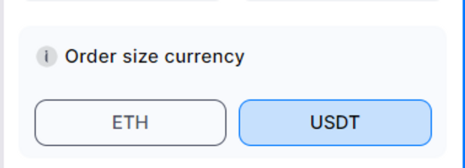 Вы можете настроить размер ордера для вашего GRID-бота, исходя из котируемой или базовой валюты.