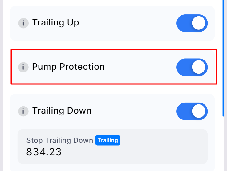 - Активируется по умолчанию: Защита от пампа включается при использовании функций Trailing Up или Trailing Down. Вы всегда можете отключить её при первоначальной настройке или при изменении параметров уже существующих ботов.