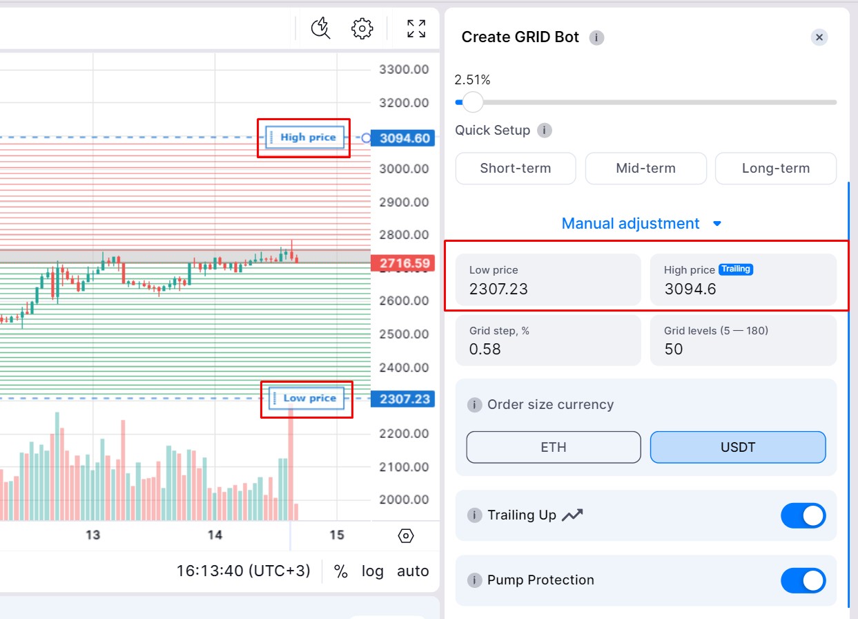 Первый шаг в настройке вашего GRID-бота — определение ценового диапазона, в котором бот будет работать. Это достигается установкой верхнего и нижнего пределов цены в рамках торгового диапазона. По умолчанию система устанавливает диапазон с соотношением 50:50 относительно текущей цены, при этом ордера выше текущей цены являются ордерами на продажу, а ниже — ордерами на покупку.