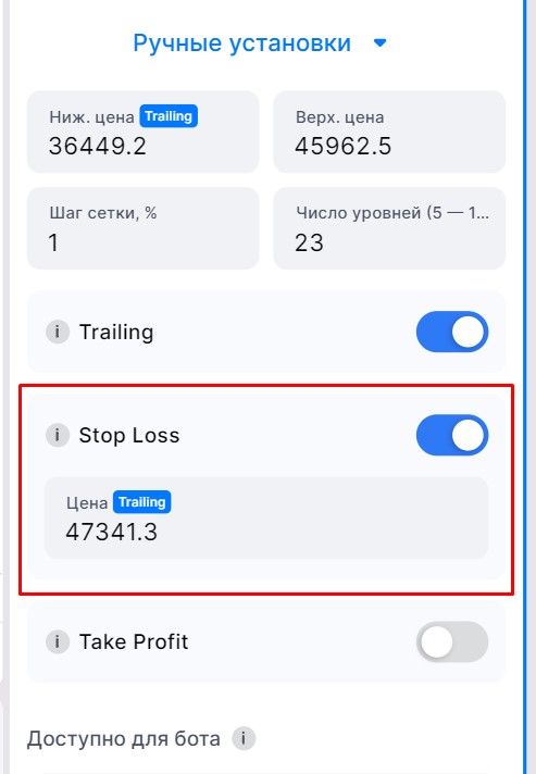 Функция Trailing Down помогает боту адаптироваться, когда цена опускается ниже диапазона сетки. Она отменяет верхние ордера на продажу и размещает новые ордера на покупку в нижней части сетки — без дополнительных средств или ручного вмешательства.