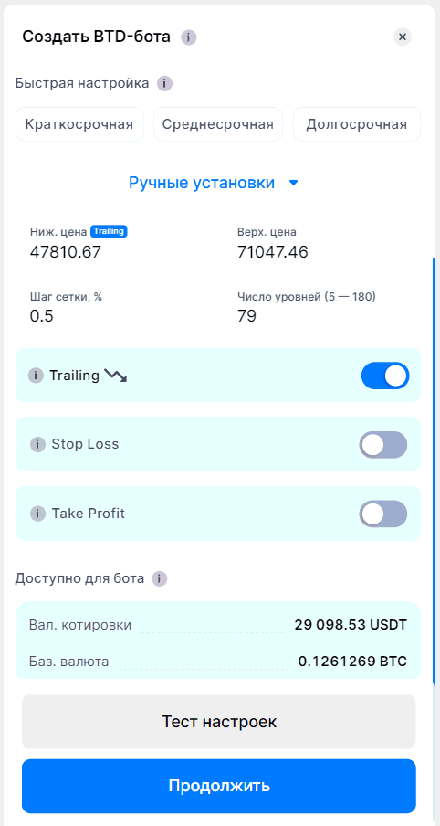Бот Buy-The-Dip (BTD) от Bitsgap предлагает гибкие параметры настройки, позволяя адаптировать торговую стратегию под рыночные условия. В этом руководстве описаны функции ручной настройки, включая конфигурацию ценовых уровней, параметров сетки и управление рисками.