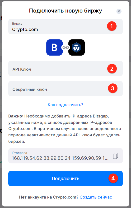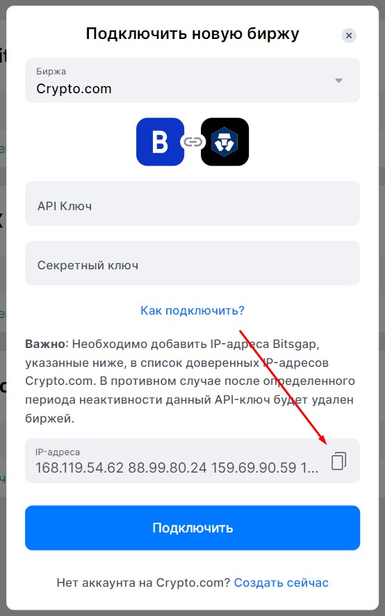 7. Выберите Crypto.com и скопируйте IP-адреса Bitsgap