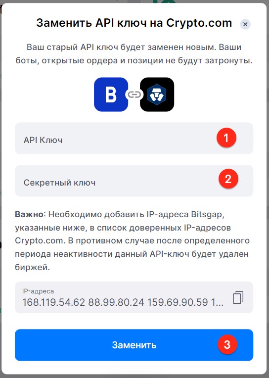 Вставьте новые API ключ и секретный ключ. Для обновления настроек API ключа нажмите кнопку [Заменить].