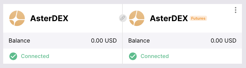 Asterdex появится в списке бирж со статусом Connected.