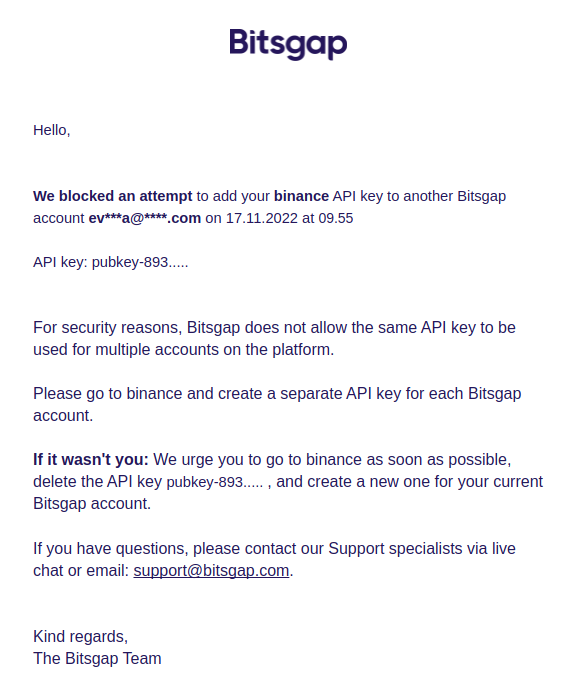 2. Покажет всплывающее сообщение о том, что ключ уже используется в другом аккаунте Bitsgap.