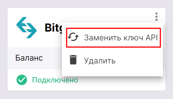 Перейдите на страницу «Мои биржи» и найдите свой API ключ Bitget. Выберите дополнительные опции, нажав на три точки в правом верхнем углу, затем выберите [Заменить ключ API].