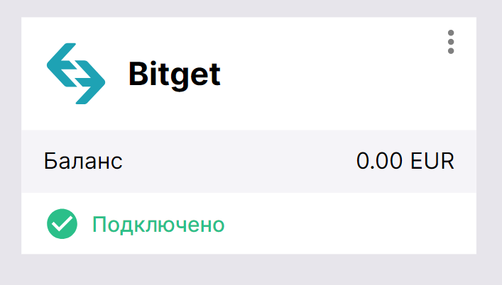 Если всё сделано правильно, вы увидите, что Bitget добавлена в список ваших подключённых бирж со статусом Подключено и торговым балансом, доступным на вашем аккаунте.