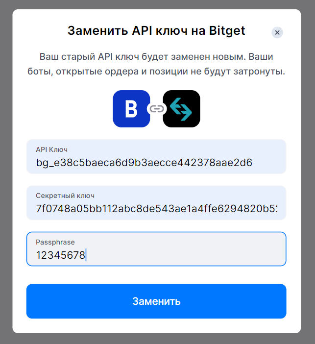 Вставьте новые API ключ, секретный ключ и кодовую фразу(passphrase). Для обновления настроек API ключа нажмите кнопку [Заменить].