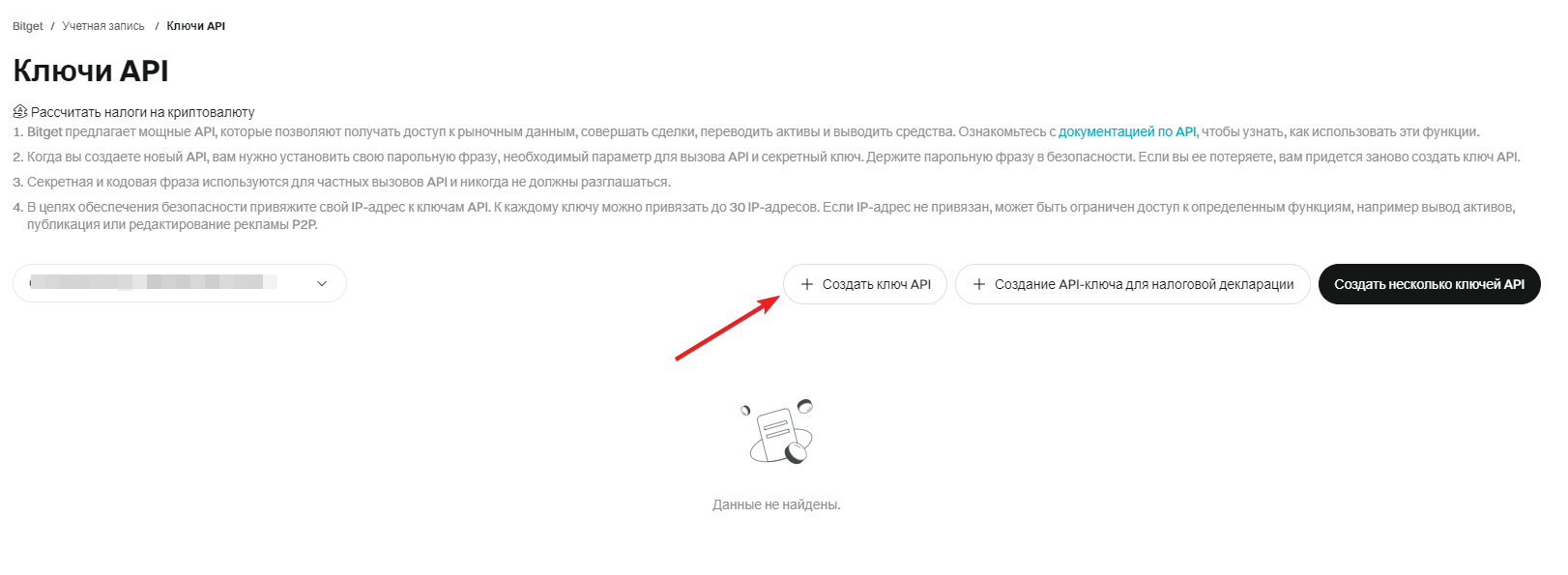 Нажмите кнопку [Создать ключ API] для создания нового API ключа.