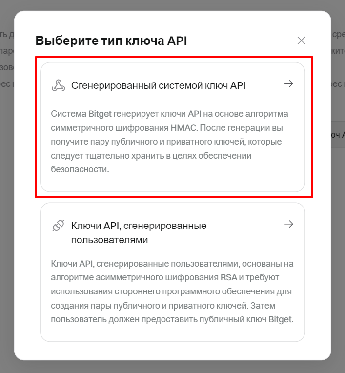 Выберите «Сгенерированный системой ключ API» и продолжайте создание вашего ключа, нажав на стрелочку.