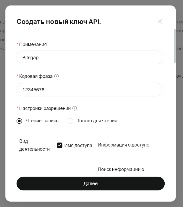 Обратите внимание, что на этом этапе вам потребуется создать кодовую фразу API. Она индивидуальна для каждого API ключа. Сохраните её в надёжном месте, поскольку она понадобится нам немного позже.