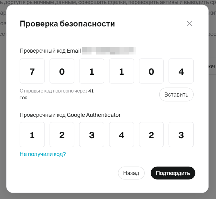 Введите код верификации по электронной почте и код 2FA, затем нажмите [Подтвердить].
