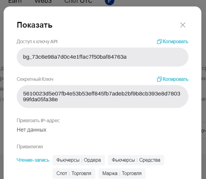 Теперь ваш торговый ключ Bitget успешно создан и готов для подключения к нашей платформе! Пожалуйста, скопируйте API ключ и секретный ключ в безопасное место, прежде чем добавлять их в Bitsgap.