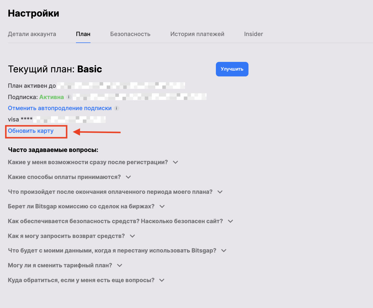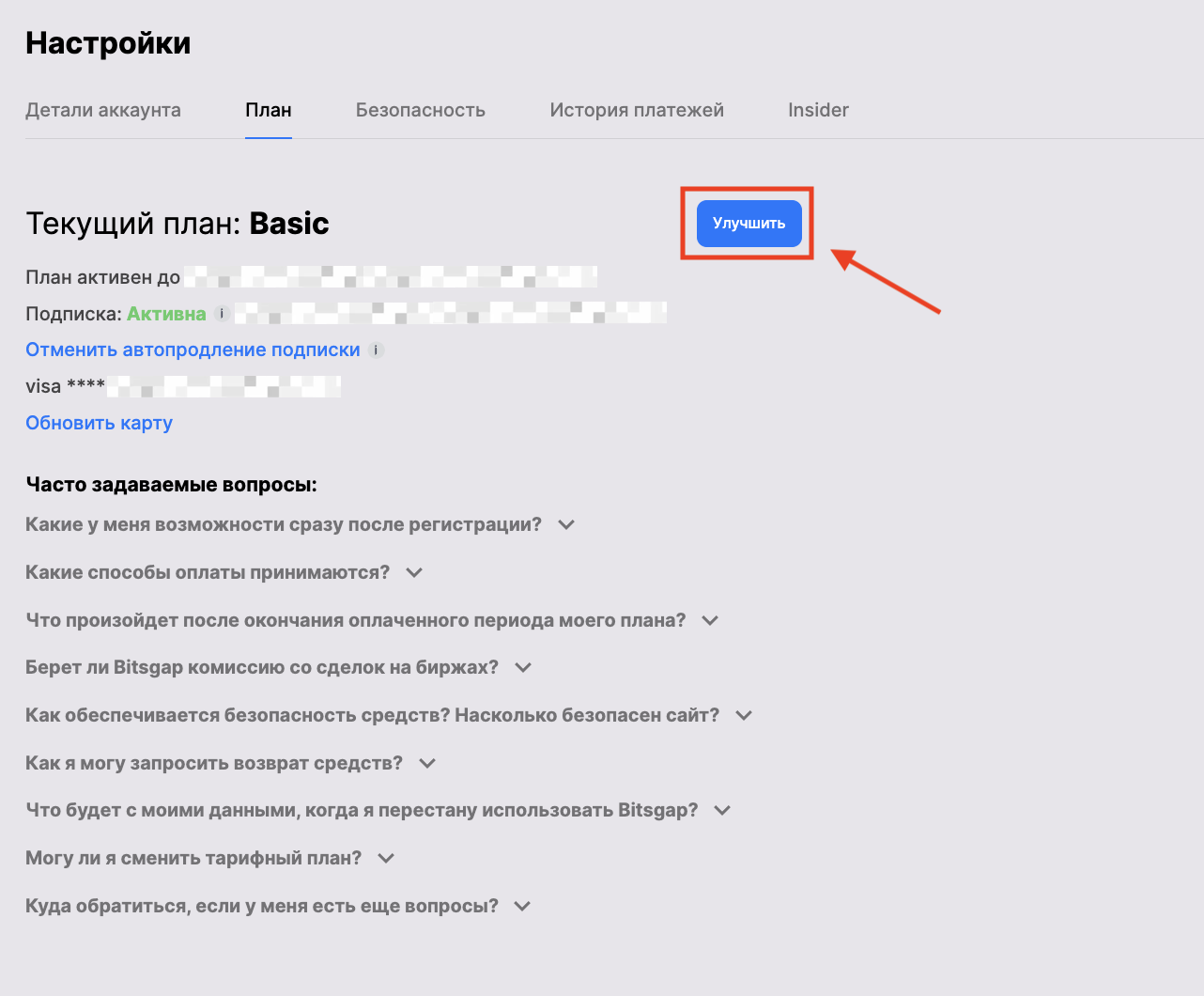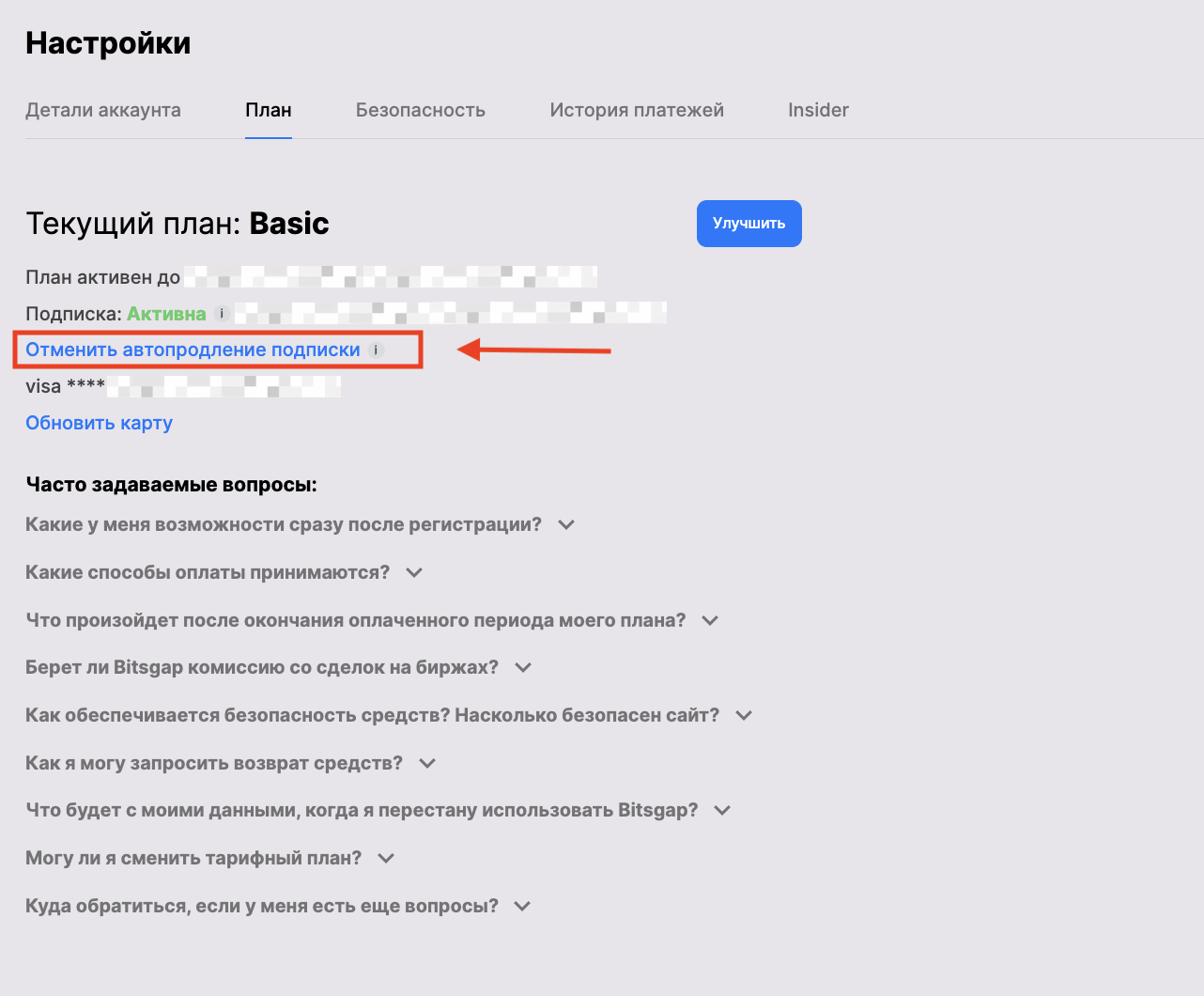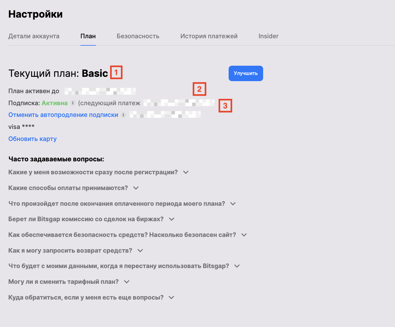 Чтобы управлять вашей подпиской на Bitsgap, перейдите на страницу «Управление планами», где вы можете просмотреть и настроить детали вашего текущего плана, включая условия подписки и способы оплаты.