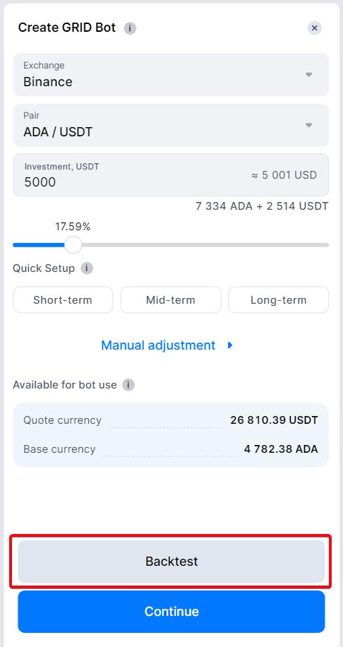 Backtest aracı, bot başlatma ayarları menüsünde mevcuttur.