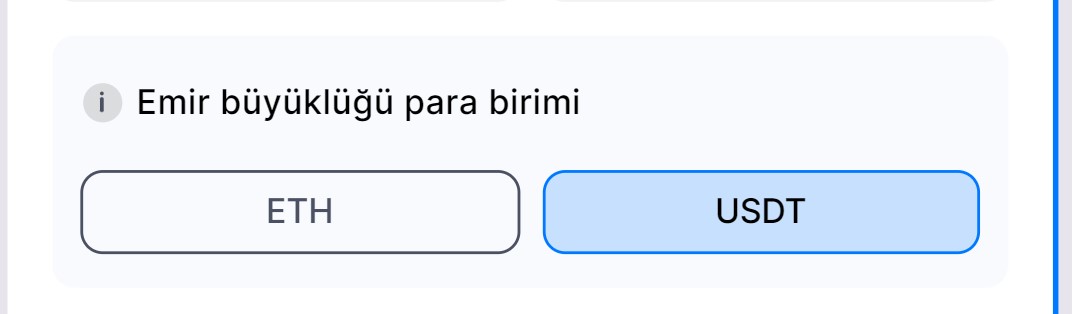 • Baz Para Birimi: Alternatif olarak emir büyüklüğünü baz para birimi üzerinden belirleyebilirsiniz. Bu durumda bot, her işlemde sabit miktarda baz para birimi alır veya satar. Daha büyük bir yatırım gerektirir ancak fiyat yükseldiğinde daha yüksek kâr potansiyeli sunar.