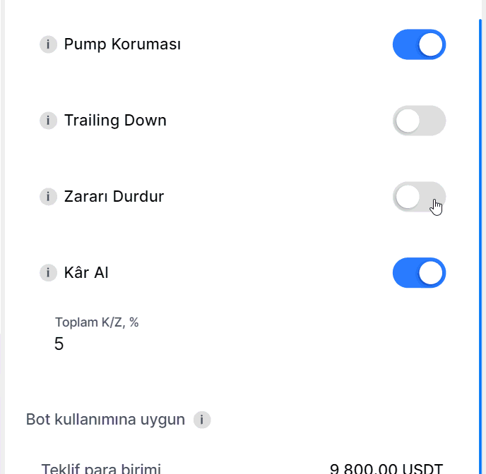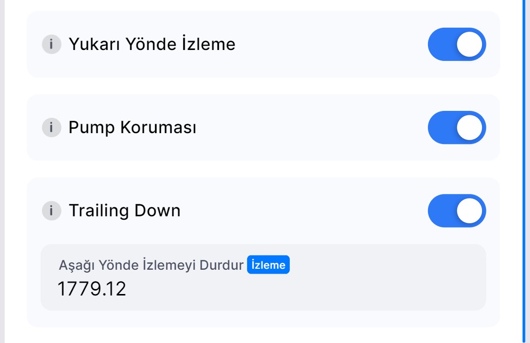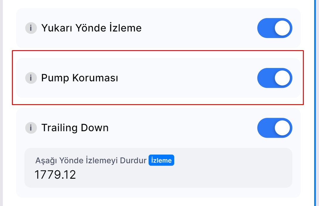 • Varsayılan Olarak Etkin: Trailing Up veya Trailing Down özellikleri kullanıldığında Pump Koruması otomatik olarak etkinleştirilir. Ancak, ilk ayarlarda veya mevcut botları düzenlerken bu korumayı devre dışı bırakabilirsiniz.