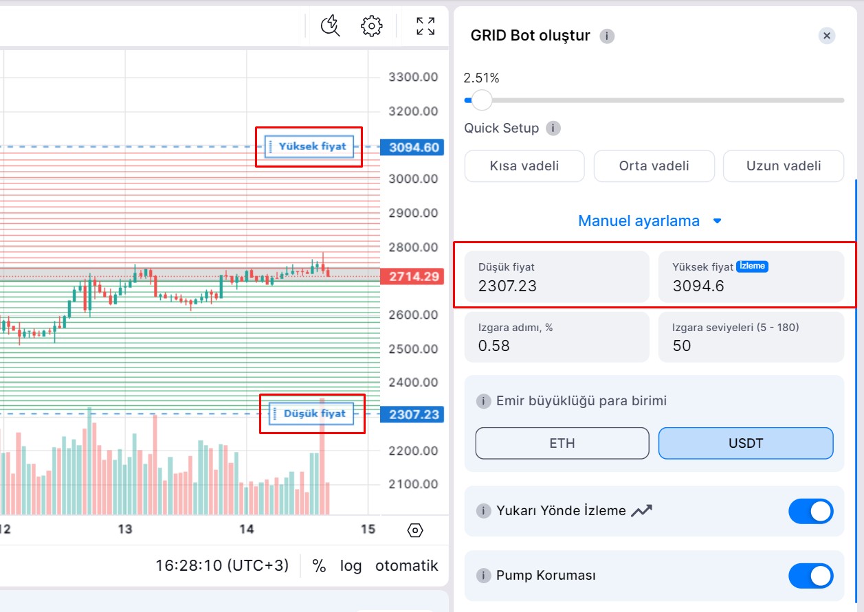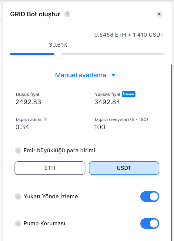 Önemli Not: Yüksek ve düşük fiyatları ayarlarken, varsayılan olarak yalnızca grid adımı (yüzde olarak) değiştirilir; grid seviyesi sayısı sabit kalır. Grid adımını veya seviye sayısını düzenledikten sonra, son düzenlenen parametre sabitlenir ve diğeri buna göre otomatik olarak ayarlanır.