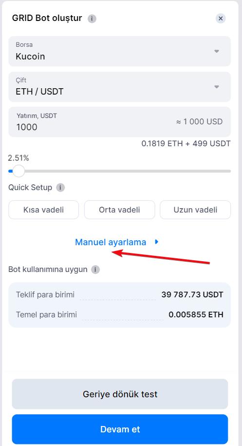 Yeni bir GRID Bot kurarken, Manuel Ayarlama bölümü botunuzu ticaret stratejinize uygun şekilde yapılandırmanıza olanak tanır. Bu ayarları etkili bir şekilde kişiselleştirmenin yolu şudur:
