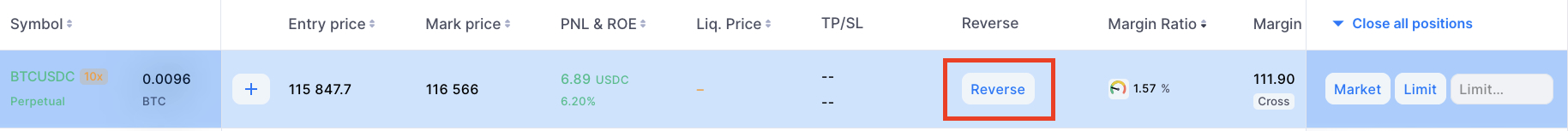 Geçerli pozisyonunuzu anında kapatmak ve aynı büyüklükte zıt bir pozisyon açmak için Reverse düğmesine tıklayın. Bu, işlem yönünü manuel ayar yapmadan hızla değiştirmenizi sağlar.