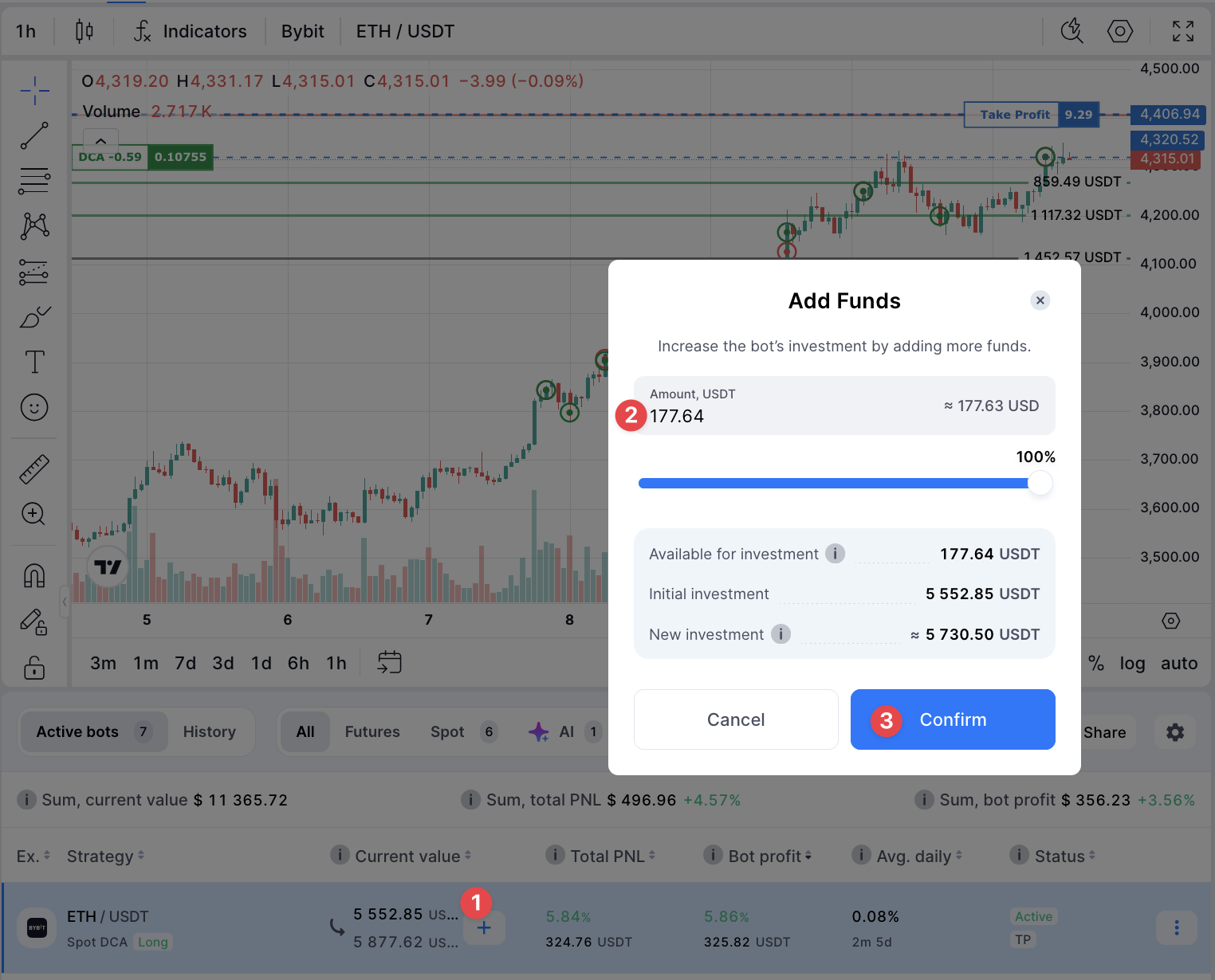 - Eklenen miktar, orijinal bot yapılandırmasına göre dağıtılır (örneğin %30 temel / %70 ortalama emirler) ve ortalama emirler aynı çarpan ve dağıtım mantığı ile yeniden hesaplanır.
