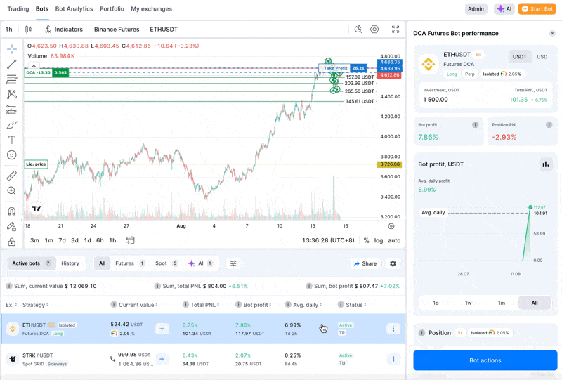 - Eklenen tutar, orijinal bot yapılandırmasına göre dağıtılır (örn. %30 base / %70 averaging orders); averaging emirleri aynı çarpan ve tahsis mantığıyla yeniden hesaplanır.