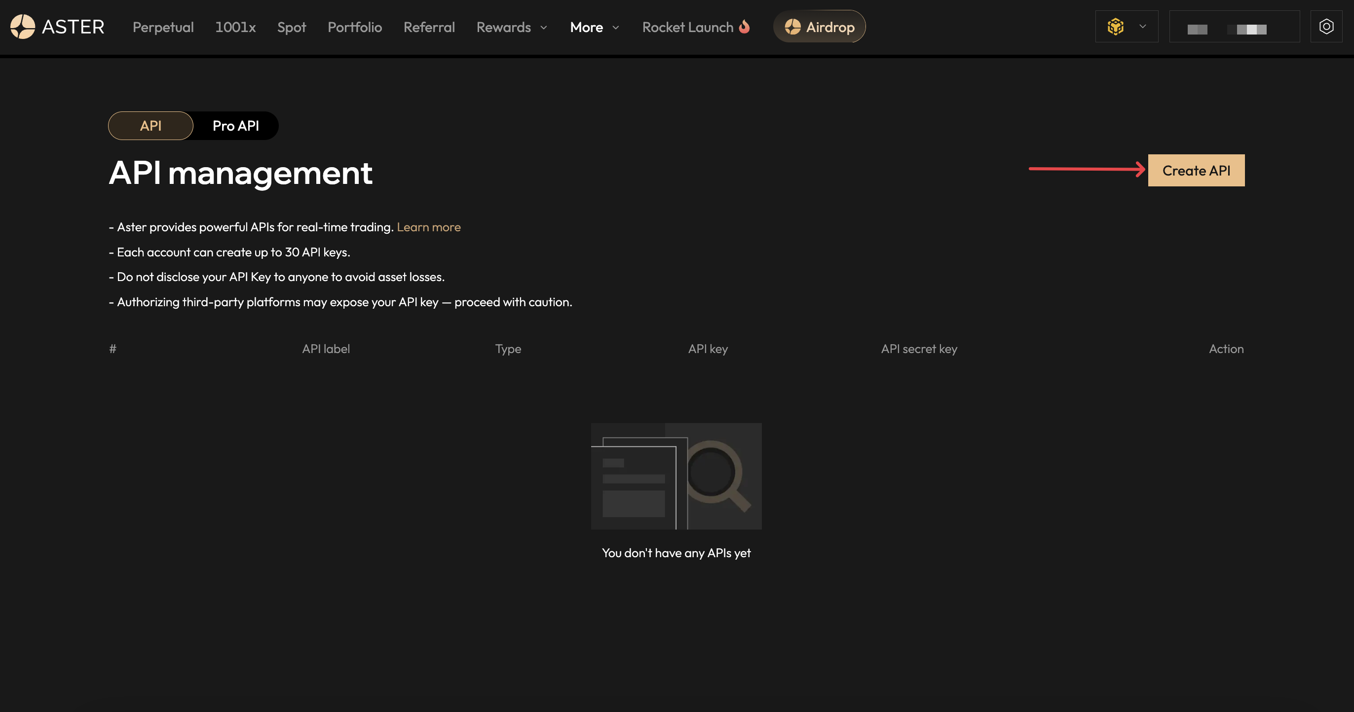 Aşağıdaki adımları izleyerek Asterdex’te API anahtarınızı oluşturabilirsiniz.