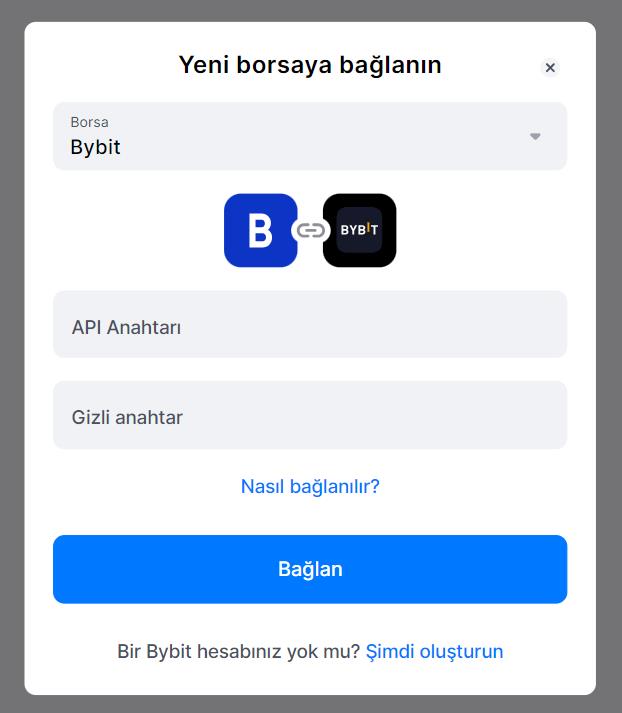Açılır pencereden Bybit'i seçmeniz gerekir. API anahtarınızı ve Gizli anahtarınızı ekleyebileceğiniz bir pencere açılacak ve ardından [Bağlan]'a tıklayın.