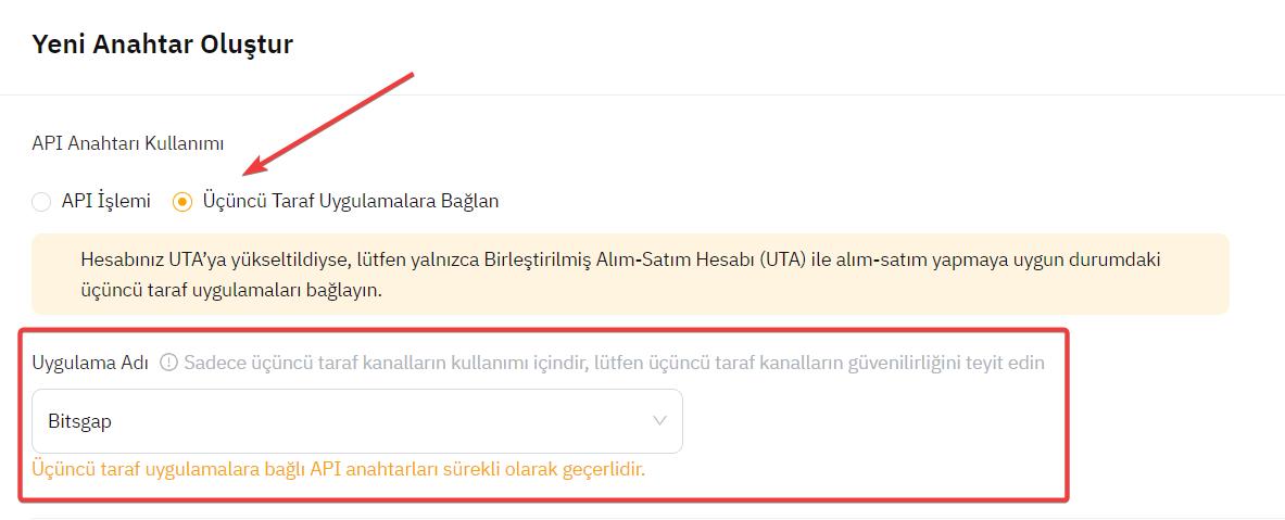 İlk olarak, Üçüncü Taraf Uygulamalarına Bağlan seçeneğini seçin ve Uygulama Adı olarak Bitsgap'ı seçin.