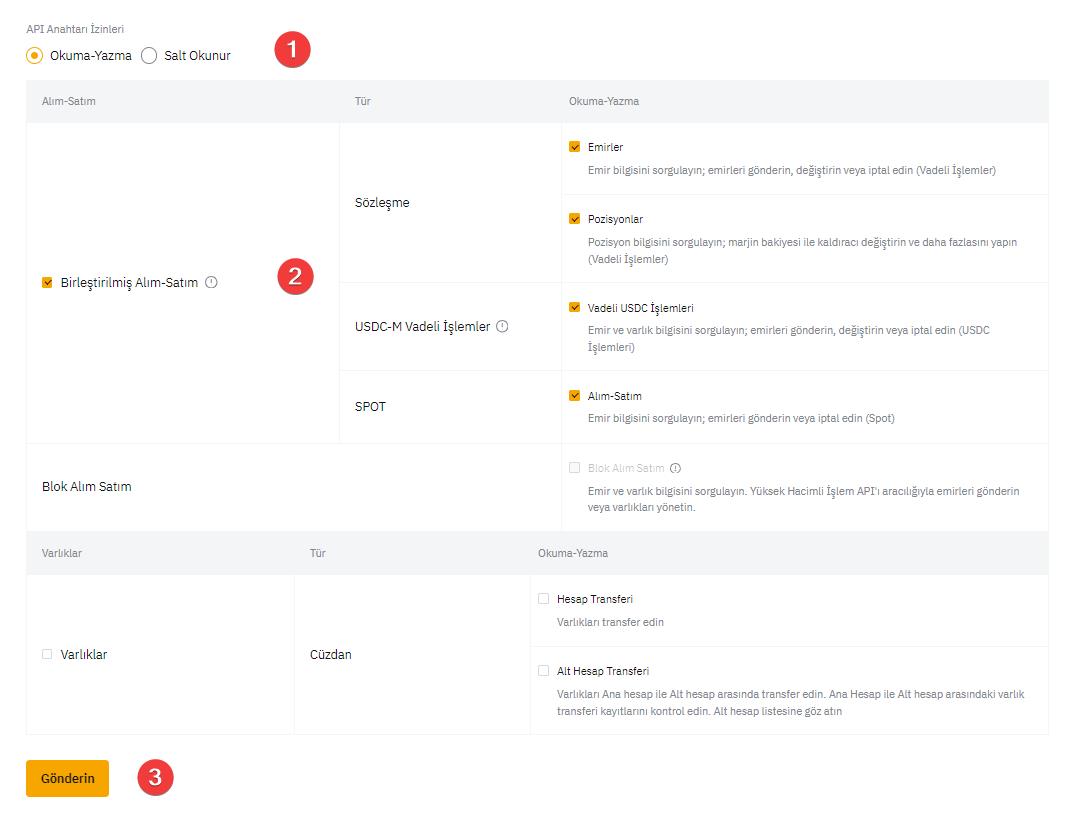 İzinlerinizi aşağıdaki örnekte olduğu gibi düzenleyin. Bu, geçmişinizi ve mevcut bakiyenizi okumamıza ve borsa hesabınızda işlem yapmamıza olanak tanıyacaktır.