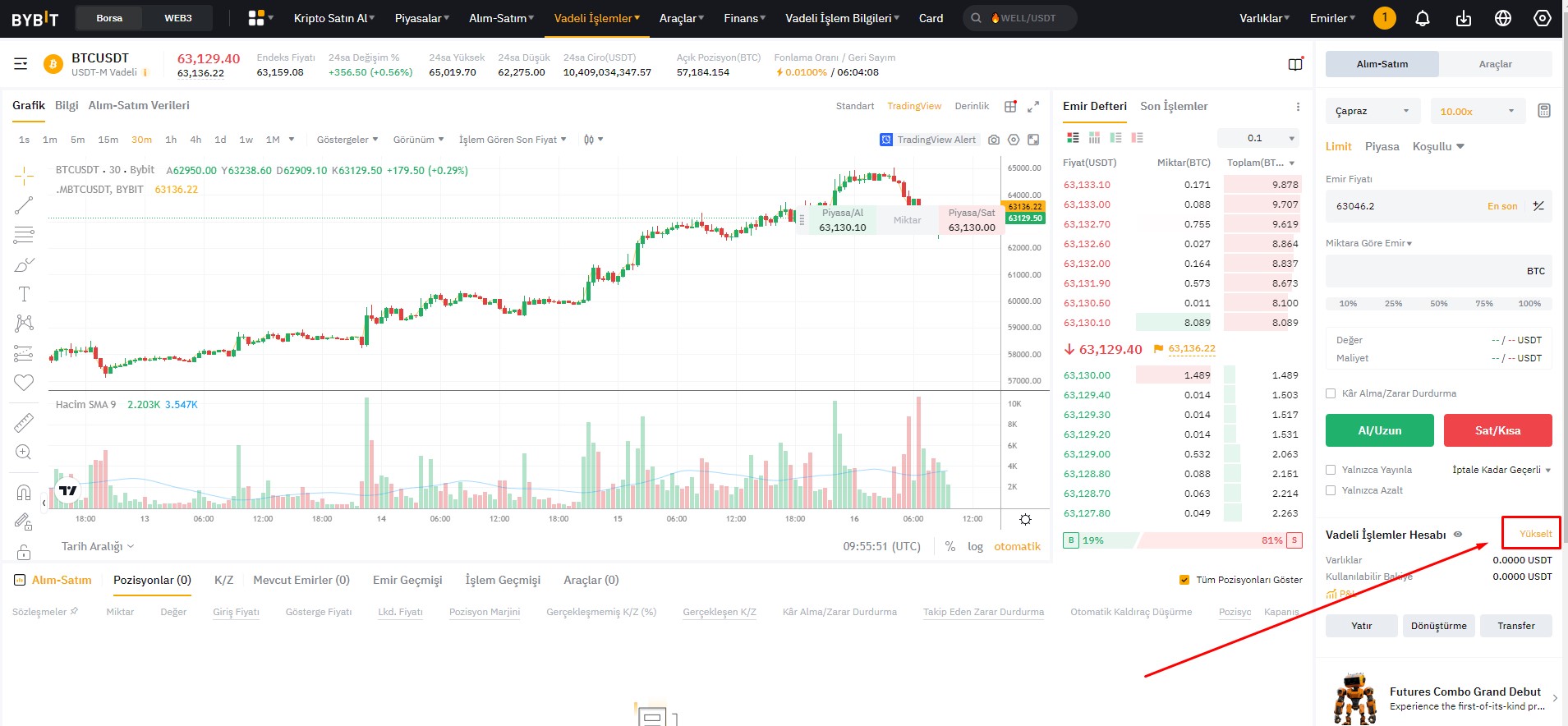 Bitsgap aracılığıyla borsada işlem yapabilmek için UTA'ya yükseltme yapmak önemlidir. Bunu yapmak için Bybit İşlem veya Türevler sayfasına gidin ve Yükseltme seçeneğine tıklayın: