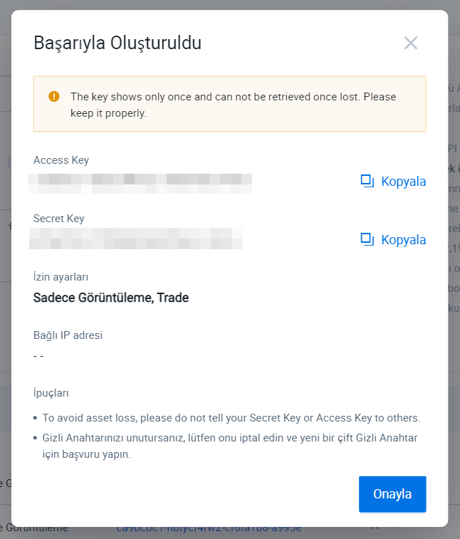 5. API anahtarınızı ve Gizli anahtarınızı kopyalayın