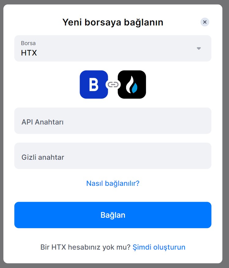 Açılır pencereden HTX'yi seçmeniz gerekir. API anahtarınızı ve Gizli anahtarınızı ekleyebileceğiniz bir pencere açılacak ve ardından [Bağlan]'a tıklayın.