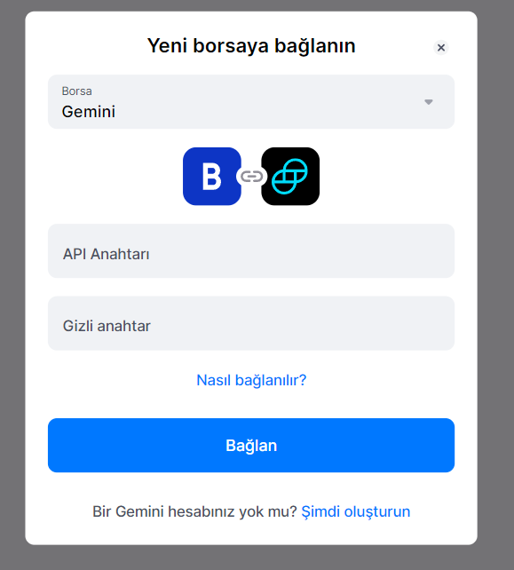 8. Gemini borsasını seçin ve API bilgilerinizi girin