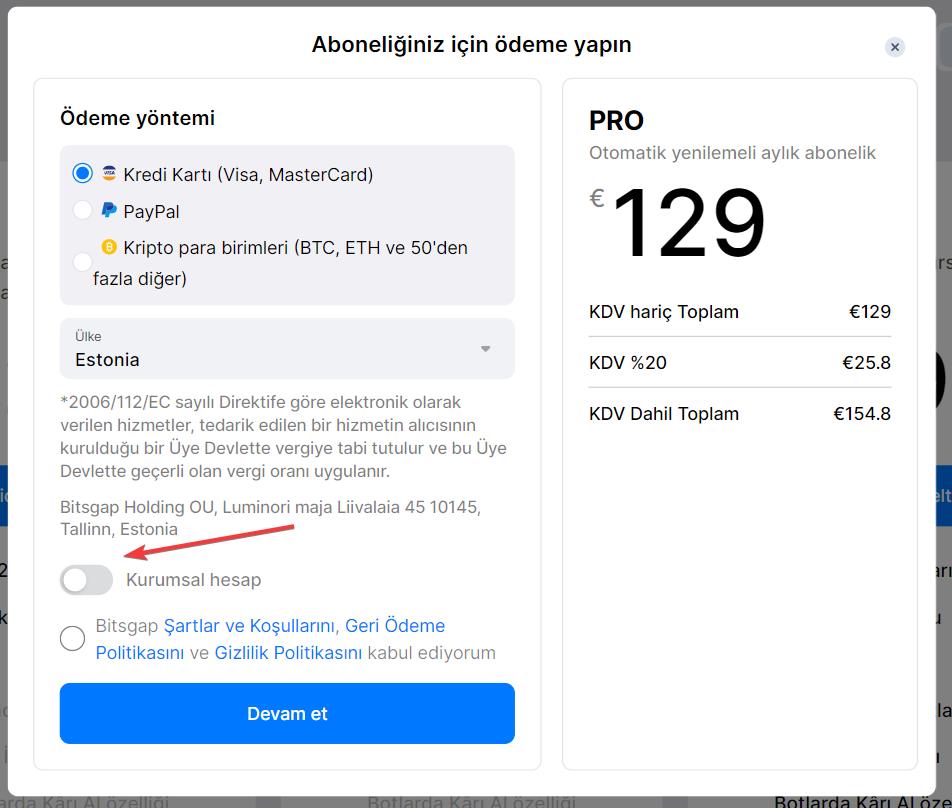 Ödeme sayfasında "Kurumsal hesap" seçeneğini açın.