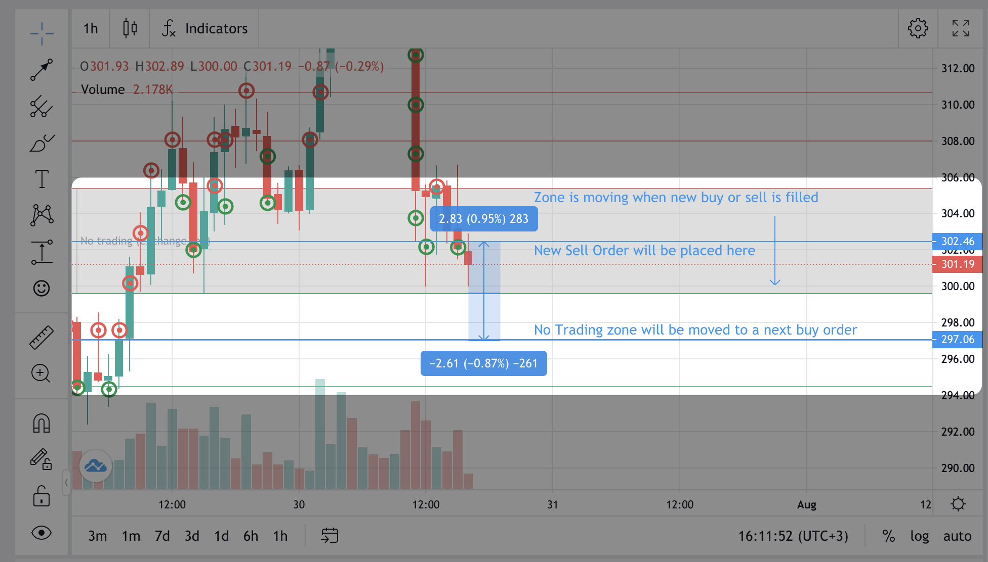 - Trong khu vực này không cần đặt thêm lệnh mới, vì lệnh tiếp theo sẽ chỉ được đặt khi lệnh ngược lại (Mua hoặc Bán) được thực hiện.
