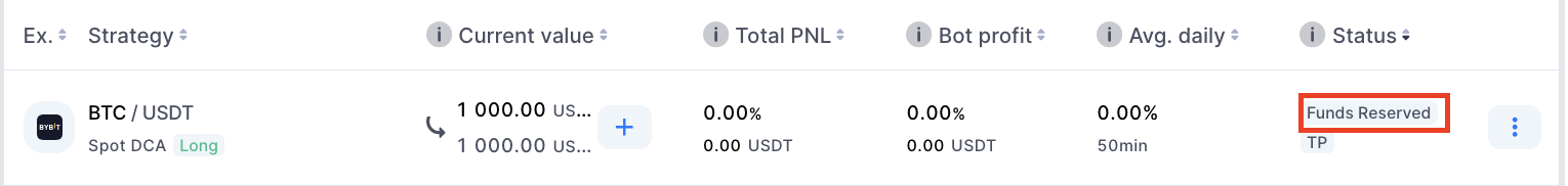 - Trong danh sách Bot, bot hiển thị trạng thái: Funds Reserved (thay vì “Range”).