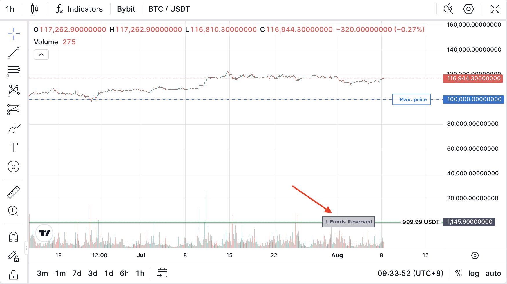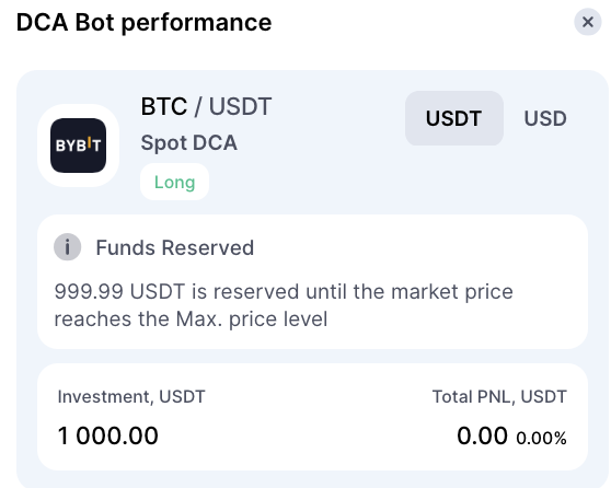 Khi Max Price được bật, tùy chọn Reserve Funds sẽ khả dụng và được bật theo mặc định. Nó đảm bảo toàn bộ khoản đầu tư của bạn được giữ lại khi bot chờ giá thị trường đạt đến Max Price của bạn (đối với Long bot, điều này nghĩa là giá phải giảm).