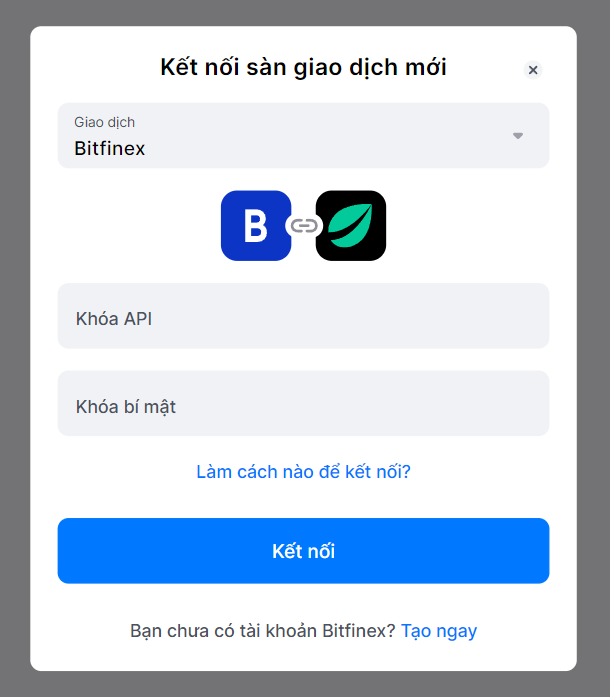 Từ cửa sổ bật lên, bạn cần chọn Bitfinex. Thao tác này sẽ mở ra một cửa sổ nơi bạn có thể thêm Khóa API và Khóa bí mật, sau đó nhấp vào [Kết nối].