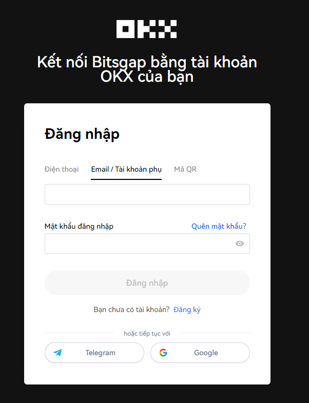 Để kết nối tài khoản OKX của bạn với Bitsgap, vui lòng nhập thông tin đăng nhập tài khoản OKX của bạn và nhấp vào nút [Đăng nhập].
