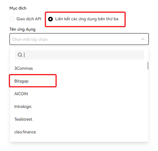 Để tạo khóa API cho Bitsgap, hãy nhấp vào nút [Liên kết các ứng dụng của bên thứ ba] trong phần Mục đích và chọn Bitsgap từ danh sách Tên ứng dụng.