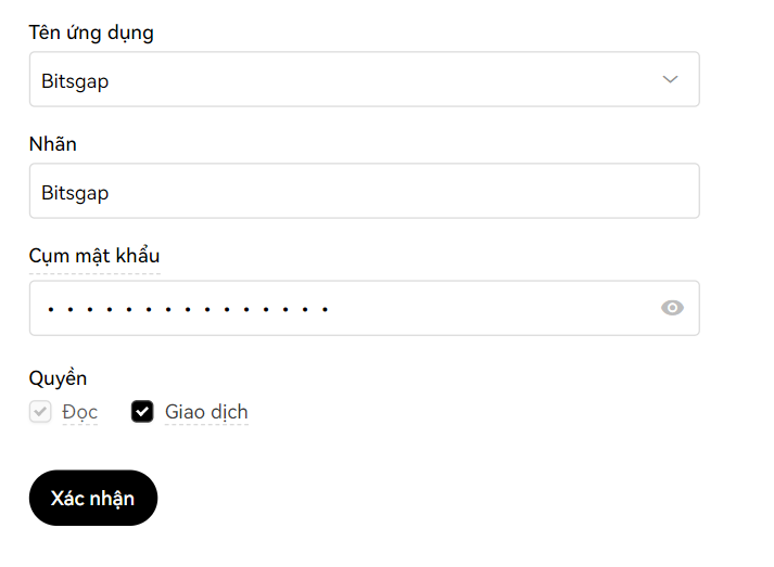 Đặt tên bất kỳ cho khóa API (đó là lựa chọn cá nhân của bạn), để bạn có thể dễ dàng hiểu rằng khóa này được kết nối với tài khoản Bitsgap của bạn.