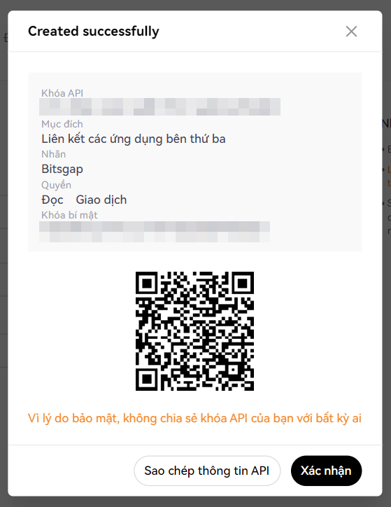 Giờ đây, khóa giao dịch OKX của bạn đã được tạo thành công và sẵn sàng kết nối với nền tảng của chúng tôi! Vui lòng sao chép API và Khóa bí mật của bạn ở nơi an toàn trước khi thêm chúng vào Bitsgap.