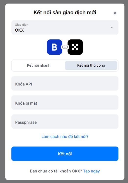 Từ cửa sổ bật lên, bạn cần chọn OKX. Trong cửa sổ Kết nối thủ công, bạn có thể dán Khóa API, Khóa bí mật và Cụm mật khẩu. Sau đó nhấp vào [Kết nối].