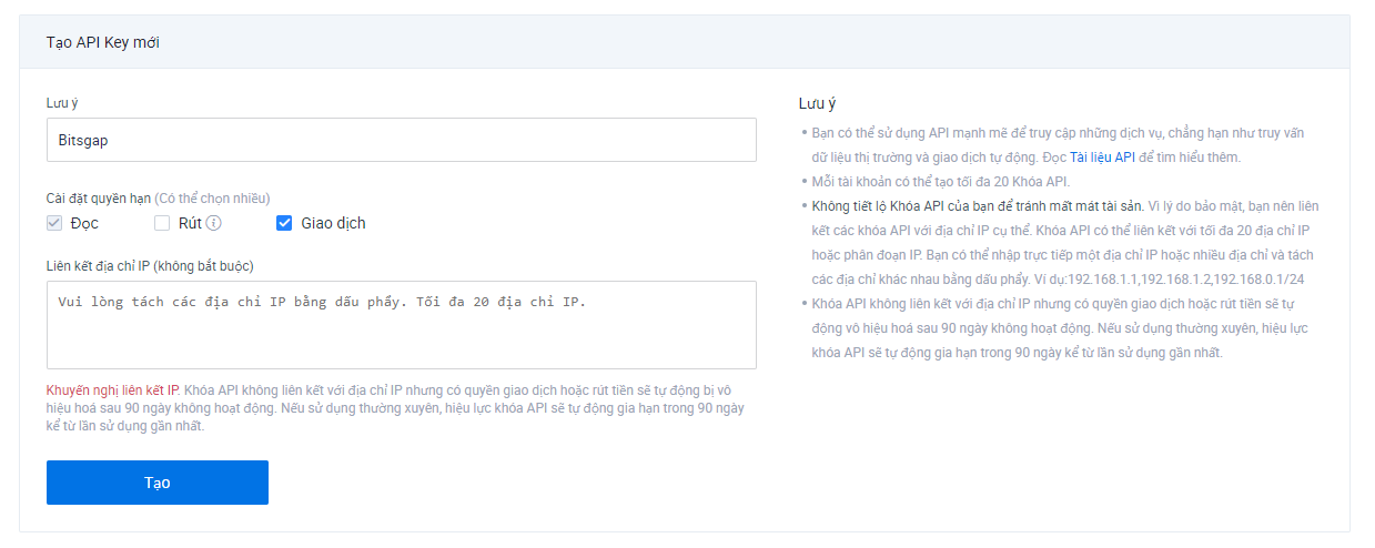 Đặt tên bất kỳ cho khóa API (đó là lựa chọn cá nhân của bạn), để bạn có thể dễ dàng hiểu rằng khóa này được kết nối với tài khoản Bitsgap của bạn.