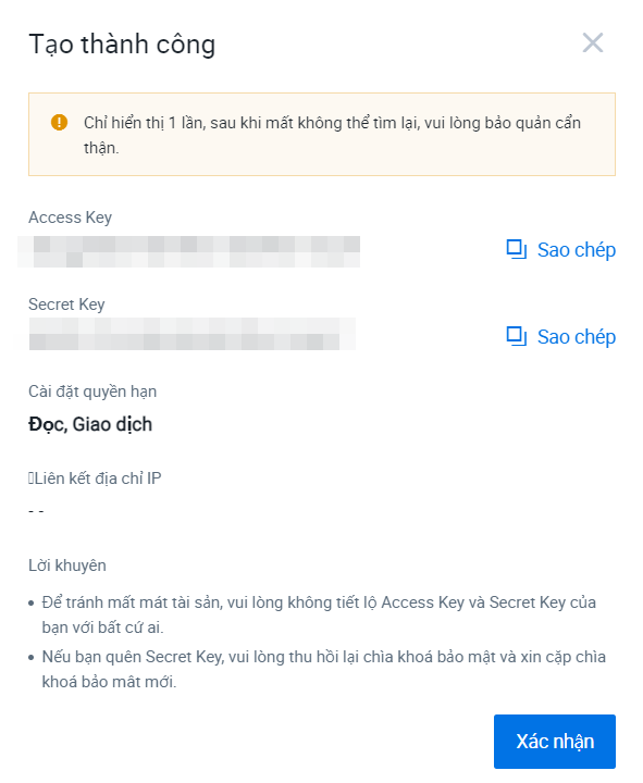 Tất cả các hoạt động giao dịch được tạo và xử lý bằng cách sử dụng khóa API trao đổi duy nhất dành cho tất cả mọi người dùng. Khóa API là một cách an toàn và đáng tin cậy để sử dụng sàn giao dịch vì khóa này không cấp quyền truy cập vào dữ liệu cá nhân của bạn và ngăn mọi hoạt động quản lý vốn (nạp và rút tiền).