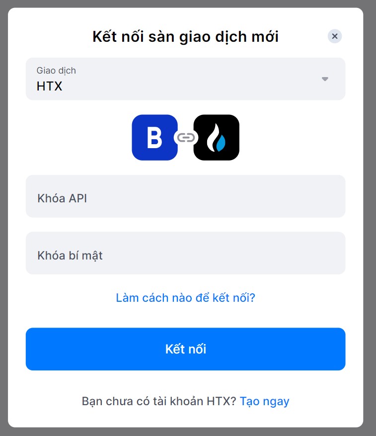 Từ cửa sổ bật lên, bạn cần chọn HTX. Thao tác này sẽ mở ra một cửa sổ nơi bạn có thể thêm Khóa API key và Khóa bí mật, sau đó nhấp vào [Kết nối].