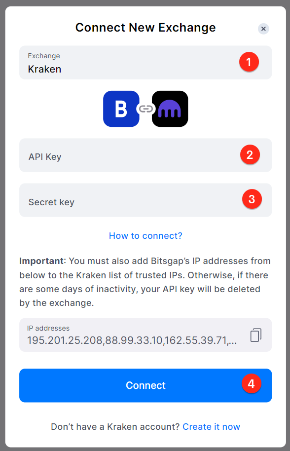 Sao chép các địa chỉ IP đáng tin cậy của Bitsgap hiển thị trong cửa sổ thiết lập Kraken. Lưu trữ chúng ở nơi an toàn để sử dụng sau.